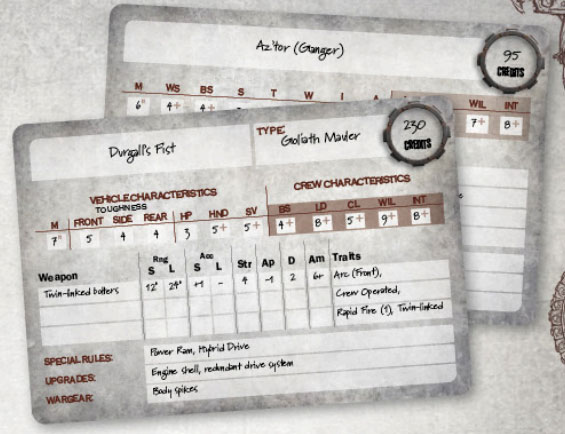 Each player's gang is made up of a number of fighters and vehicles, each of which is represented by a model on the battlefield and by a Fighter card or Vehicle card filled in with their characteristics, equipment and other useful reference information. During a battle, these cards provide a handy reference for each model and a reminder of their equipment and any special rules. During a battle, players can also place markers on each model's card rather than next to the model itself on the battlefield, thus keeping it free from clutter.