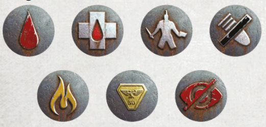 Markers can be used to represent a model's Status, to indicate a model is subject to a Condition, or to keep track of such things as lost Wounds or Hull Points and can be placed next to them on the battlefield or on their Fighter card or Vehicle card. Examples include Ready markers (one of which is placed next to every model at the start of each round, and removed after they have been activated), Out of Ammo markers (used to indicate a weapon has run out of ammunition, jammed or otherwise malfunctioned) and Blaze markers (used to indicate a model is on fire or, as the rules would say 'subject to the Blaze condition'), amongst others.